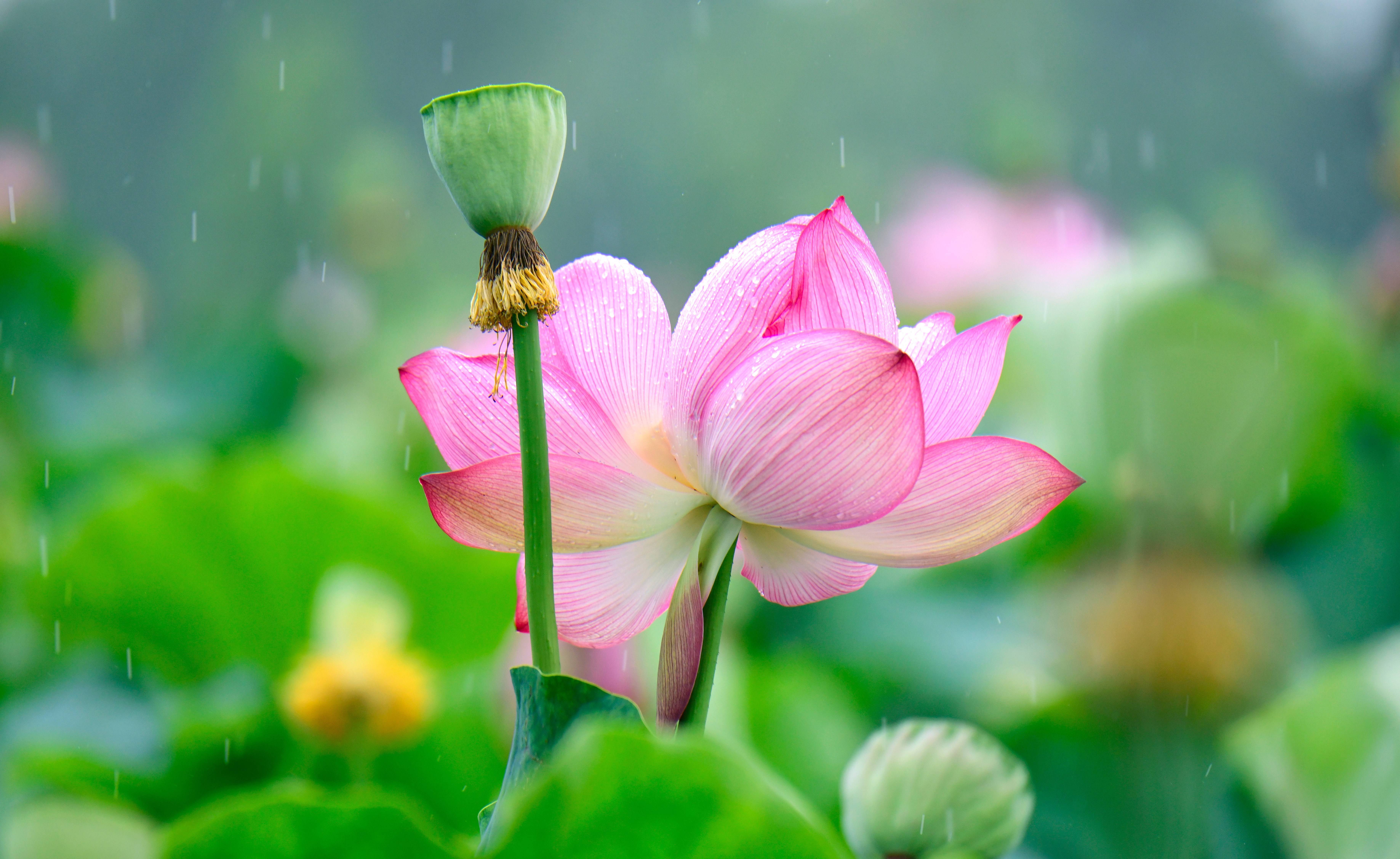 ↑2025年6月8日在云南省弥勒市太平街道牛背村拍摄的雨中荷花。CICPHOTO/普佳勇 摄